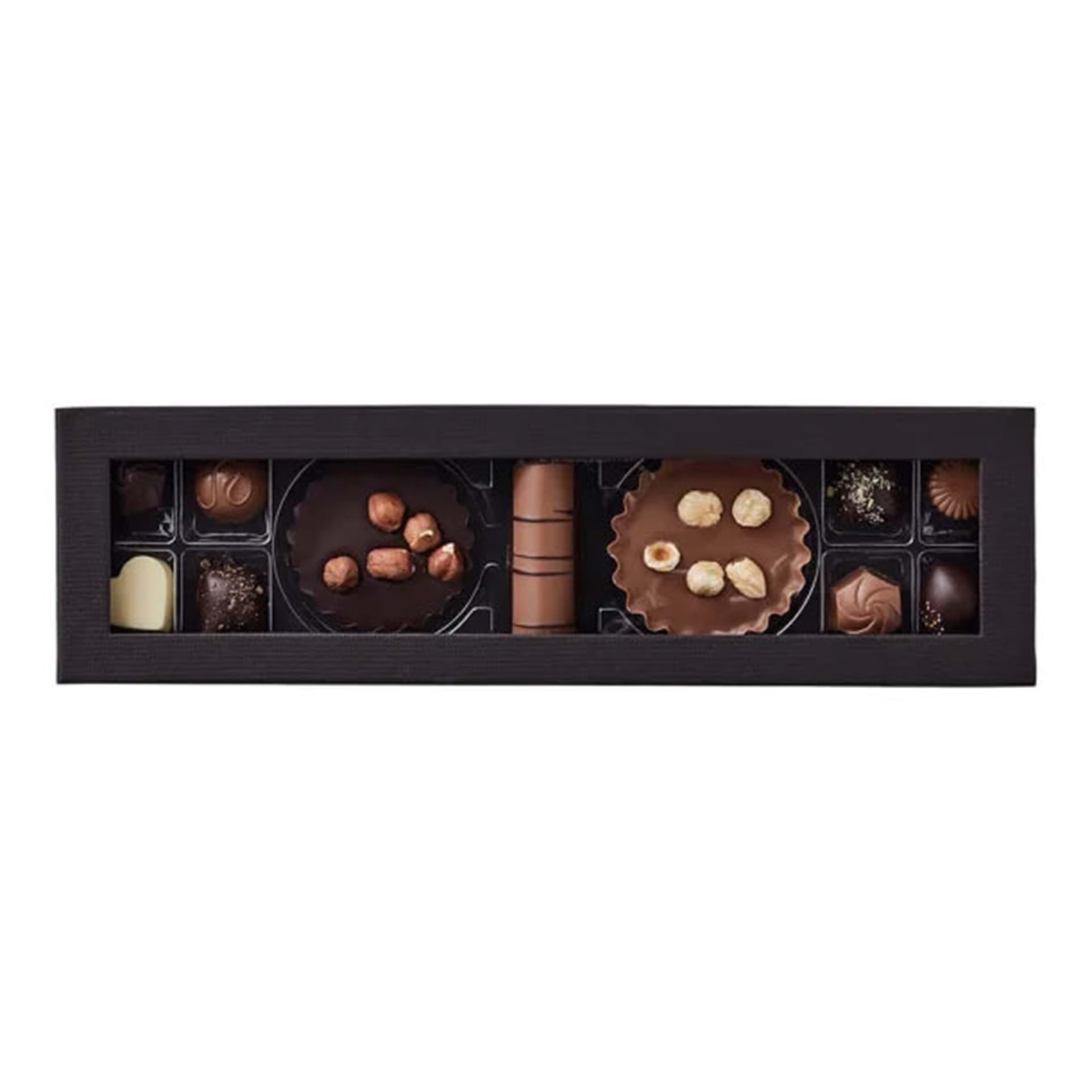 Sukker, MANDLER, kakaomasse, kakaosmør, glukosesirup, SØDMÆLKSPULVER, vand, invertsukkersirup, HASSELNØDDER, sødet kondenseret SKUMMETMÆLK, VALNØDDEKERNER, SKUMMETMÆLKSPULVER, vegetabilsk fedt (kokos), karamel pulver med MÆLKEFEDT (SKUMMETMÆLKSPULVER, VALLEPULVER, sukker, MÆLKEFEDT, naturlig vaniljearoma), appelsinskal,naturlig vaniljearoma, salt, karamelliseret sukker, glukose fruktosesirup, frysetørret hindbær, emulgator (E322: SOJA: E471), surhedsregulerende middel: E330, emulgator E471, naturlig aroma, naturlig orange aroma, farvestof: E160e.