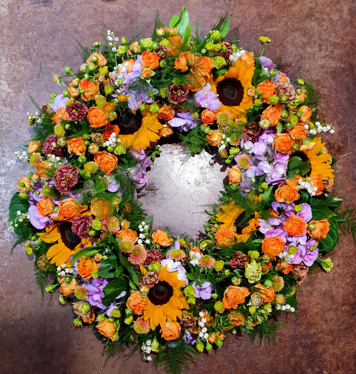 En rundpyntet krans er en smuk måde at tage afsked på, Kransen er bundet med blomster hele vejen rundt.